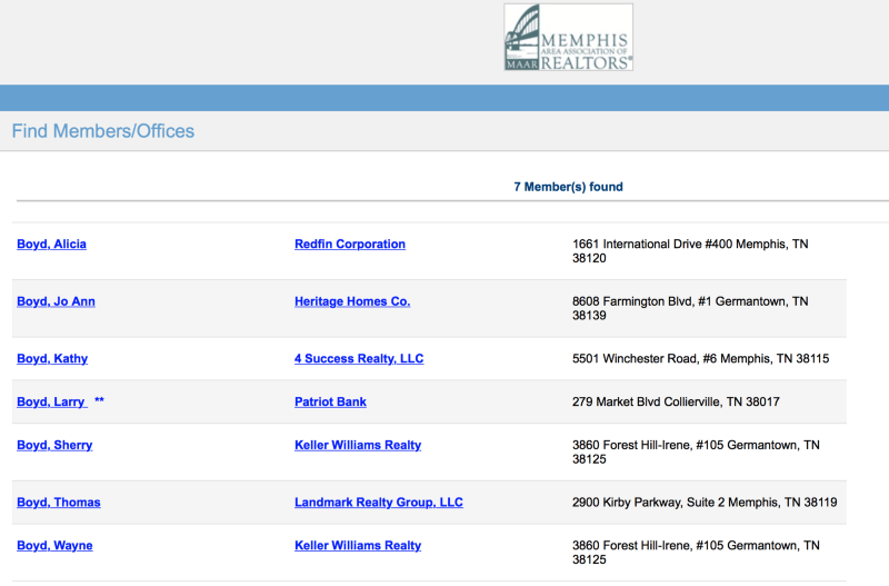 Appendix 2 is a screenshot of Berlin Boyd’s campaign website from his City Council run in 2015, claiming membership of Memphis Area Realtors Association. We assume he means MAAR, which, when called, were unable to find records of Boyd ever being a member. Appendix 3 is a listing of MAAR’s membership, taken in September 2015, showing no listing for Berlin Boyd. The campaign website is no longer hosted.