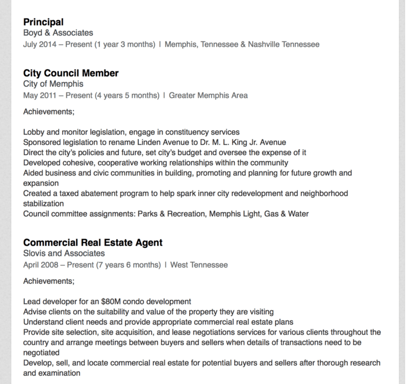 In summary, Berlin Boyd falsified his educational and professional qualifications in the resume he presented to the people of Memphis during the 2015 campaign. He still got the job and the press, although they were aware of his false claims of being a Commercial Real Estate broker, refused to out him.